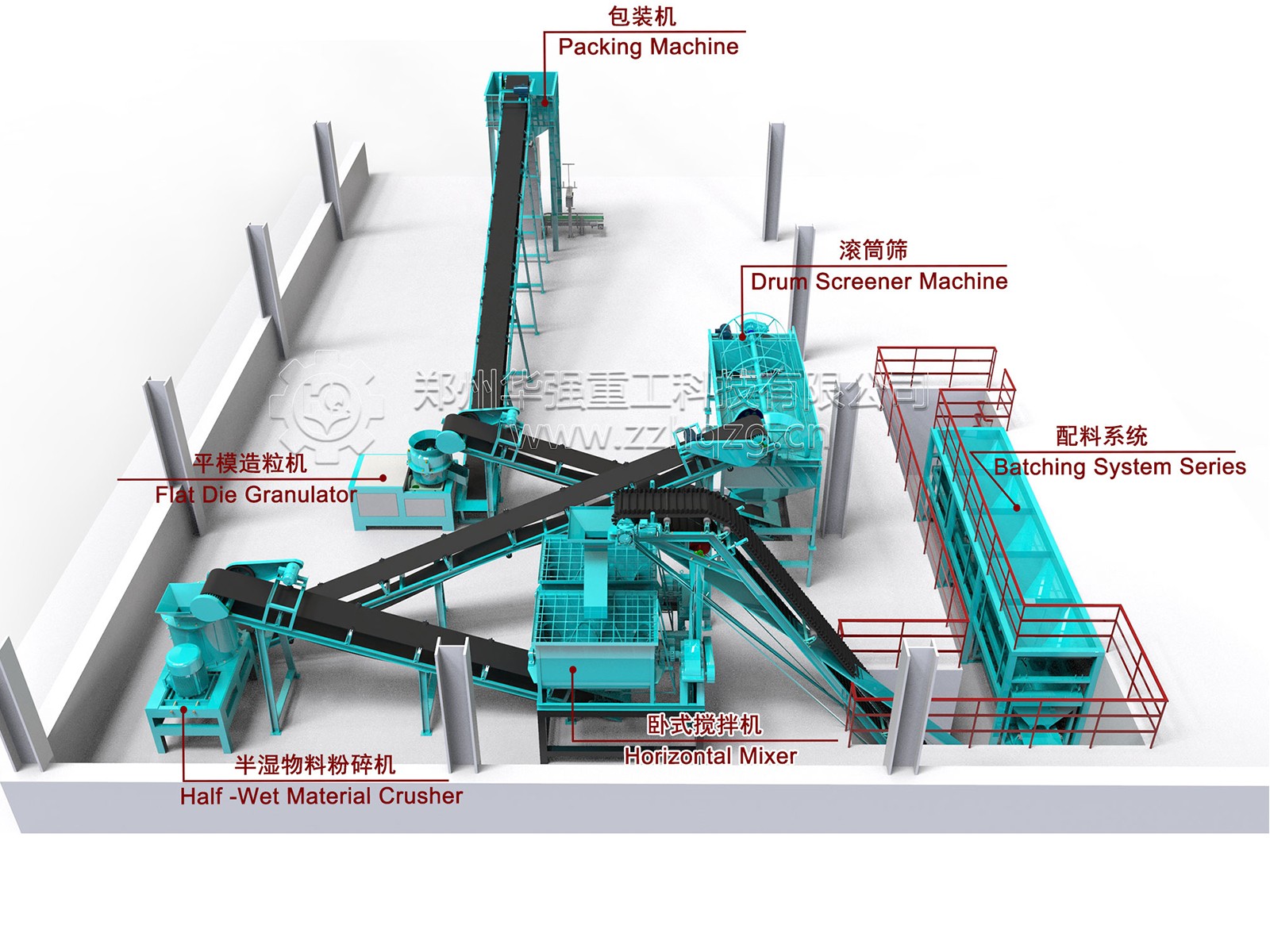 將堆肥后的物料和氮磷鉀無機(jī)肥料及其他添加物等各種原料按一定比例進(jìn)行粉碎、配比和混合。根據(jù)多年經(jīng)驗,設(shè)備配套建議如下:采用立式粉碎機(jī)粉碎牛糞堆肥物不易粘壁,不易堵塞,多層紊流鏈錘結(jié)構(gòu)改善粉碎性能;