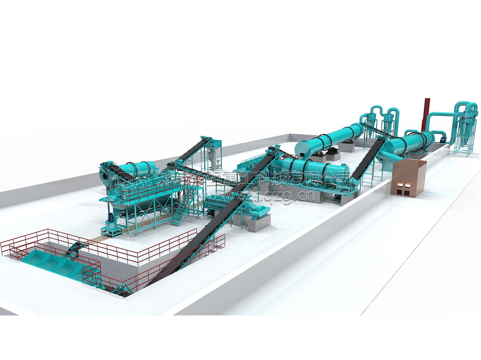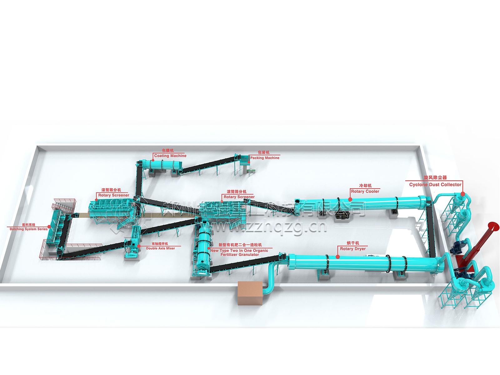 配料系統(tǒng)——雙軸攪拌機——新型有機肥二合一造粒機——烘干機——旋風除塵器——冷卻機——滾筒篩分機——自動包裝機