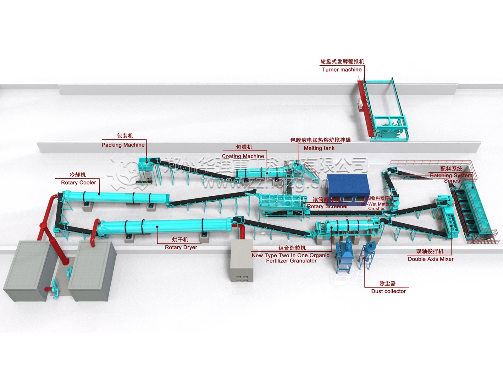 輪盤(pán)式發(fā)酵翻推機(jī)——配料系統(tǒng)——半濕物料粉碎機(jī)——雙軸攪拌機(jī)——除塵器——組合造粒機(jī)——烘干機(jī)——冷卻機(jī)——滾筒篩分機(jī)——包膜液電加熱熔爐攪拌罐——自動(dòng)包裝。